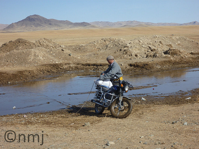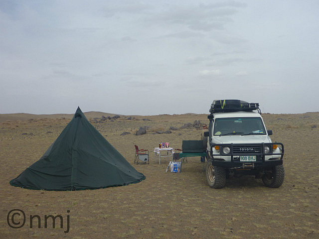 Still on the road, driving through a valley, which usually turned out to be boggy, we found a poor Mongol with his motorcycle bogged! So Nick valiantly offered to winch him out. It was funny because the Mongol thought that Nick was going into the river to help pull the bike out, but Nick was wearing his (not so clean) Moleskins and just handed him the winch cable! Finally, we decided to camp! The weather was warming up and we were seriously disillusioned with the hotels! And there were no towns of any size in the near vicinity (or within 100kms). The landscape we were driving through more closely resembled a moonscape, but we found a
