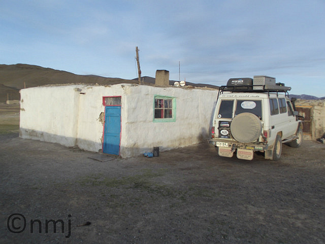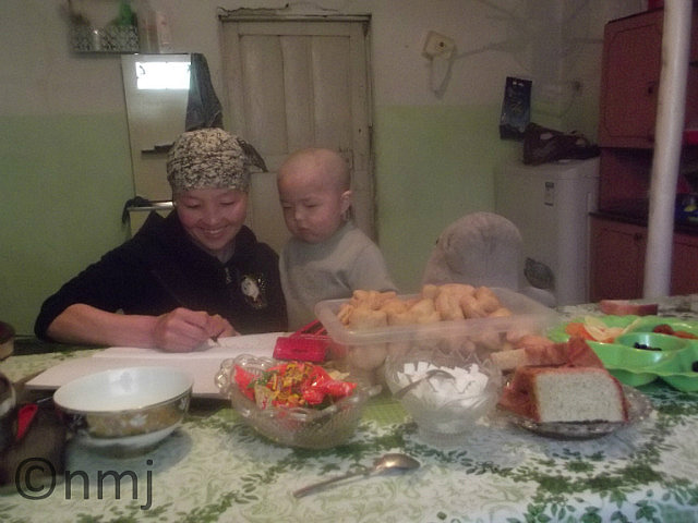 Our last day of driving was another long day (460kms) but we had decided to stop in a small blip on the map called “Tsagaanuur”. We went to the shop to ask about a hotel and we met a guy outside the shop who spoke English. He offered to take us to the hotel if we would follow him on his motorbike. He drove for about 100m and stopped at a small building and said “This is my home, you come inside”. We thought that he was inviting us in to see his home and offer maybe a cup of Chai. Which he did, but he also offered us a bed for the night. So we spent our last night in Mongolia in the home of Robert & Clara (English versions of their names) and their three little children. They were actually from Kazakhstan and Robert was an electrician working with the Mongolian Army. He spoke quite good English and his wife Clara spoke some English. We had a great afternoon but the hit was when Duggy came inside. For those of you who don’t know Duggy – he is a stuffed Dugong that travels with MJ. The boys (2yrs & 3yrs) loved Duggy!! We had lots of Kazak Chai (take a refectory-sized teapot, add 2 teaspoons of tea and 3 teaspoons of salt, then mix in 3 tablespoons of coffee-whitener), which is drinkable if you add lots of sugar! We had a lovely evening with this incredibly generous family.