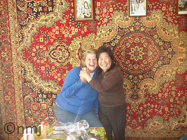 We survived the night under canvas and headed off to the next town, which was Altai (Altay?). One thing we have noticed is that the price of Diesel is going up. When we first hit UB, it was 1830 Tgr/Litre but in the Western Steppes, it has gone up to 2050 Tgr/Litre. And when you have to buy 100 litres then it becomes expensive. Everything else in Mongolia has been relatively cheap – except fuel! We reached Altai which looked like a biggish town on the map and we thought that as it was a provincial capital then it wouldn’t be too difficult to find a hotel – WRONG!! After driving up and down all the streets and being looked at like we were the new freak show in town, we found hotel where no-one spoke English (again!) and there was no Internet (again!). But then we heard some magic words, “Hi, where are you from?”. Yes, a woman had heard us speaking English and come into the hotel to help us out. Through her kind interpretation services, we worked out how to get hot water in the shower (primitive put & take system), that there was no breakfast and there was an Internet Café in town. She introduced herself with an unpronounceable (and unspellable) Mongolian name but then said “But everyone calls me The Happy Lady”, so we did too! She took us down to the centre of town (about 2 minutes walk) and showed us where the Internet Café was and also showed us where we could get some lunch. After a quick check of emails and update on Facebook, we went off to have lunch and got some sort of Mutton and Rice, with Vegetables dish – it was very tasty, but Mutton is rather fatty in texture. As we walked back to the hotel, The Happy Lady stuck her head out of her lounge window and called us in to see her home. She was having a type of Mongolian Afternoon Tea with some friends and so we had a really great afternoon chatting, answering questions and trying Mongolian Tea (milky & the tea looks like it contains more chaff than tea leaves). She invited us back for Breakfast the next morning and even promised us coffee and peanut butter for breakfast!