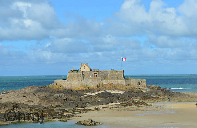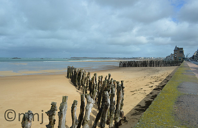 These logs are dug into the sand to act as a breakwater before the waves hit the stone walls. There is a huge tidal range in this area of the French coast.