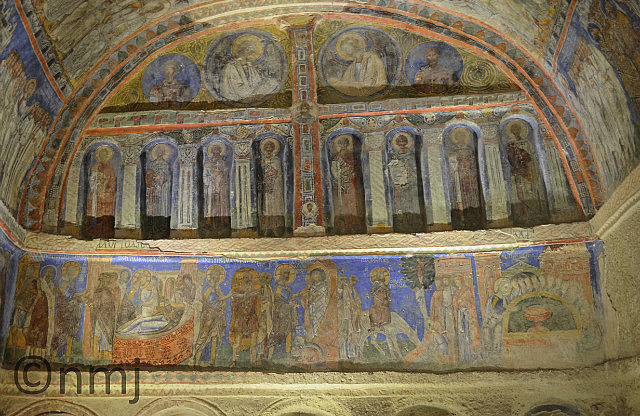 Another amazing place that we visited was an Open Air Museum at an area called Goreme. Apparently Paul (he of the Letters to the Corinthians, etc) decided that Goreme was a good place to train missionaries in the 4th Century. There is some geological explanation involving volcanic erruptions, erosion, etc but the end result is the weirdest landscape of soft rock that can be easily carved with a hard-rock cap that makes a good strong roof. And in Goreme, these was turned to good advantage – there are lots of churches that were carved out of this stone and over the centuries were decorated with Frescoes. As some of these frescoes pre-date the Iconoclastic Era, they were badly damaged, ie faces irreparably wiped out.