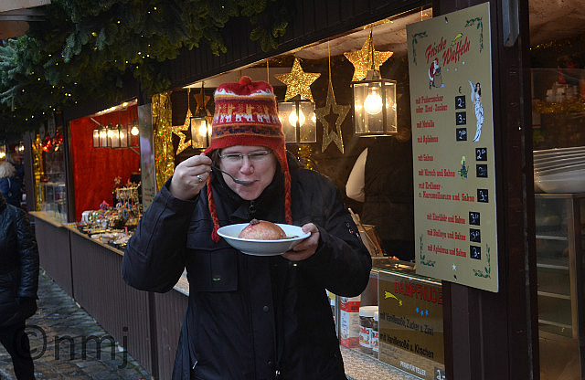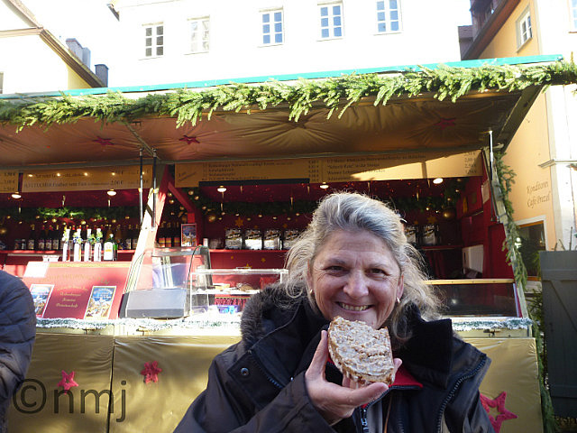 Our next Christmas Market was the grand-daddy of all Christmas Markets – Nürnberg! Our hostess took us to Nürnberg and we spent the afternoon walking around the biggest Market of them all. There are three sections to this market – the Children’s Market, the normal market and the International market. And, in case you didn’t know, Nürnberg is the originator of Nürnberger Lebkuchen. You have been able to buy this in Aldi stores in Australia, usually around late October/early November for the past few years. Anyway, it is a fantastic taste sensation. If you hate ginger biscuits (like me), then these taste nothing like that – much nicer! We also had Stollen, Dampfnudeln, Bratwurst – I’m not stepping on any scales for a while! I’m worried about how much weight I’ve put on, just at the Christmas Markets!