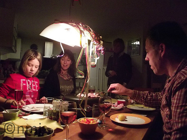 Dinner that night was a traditional Germany meal (for Silvesterabend) – Raclette, or melted cheese – like a fondue but you don’t dip, they have a set of individual trays (one for each person) and you put whatever you want on the tray, cover it with Raclette cheese and then put it under a burner which melts the cheese. You could choose from a variety of salami, ham, mushrooms, spätzle, onion and other raw vegetables. MJ loved it, but it was too much cheese for Nick. For dessert, we had a Pavlova that MJ had made with whipped cream, raspberries and blueberries. Plenty of food, great conversation, laughs – a great night for everyone. Thanks to Sabine & Simone for sharing your friends & family with us.