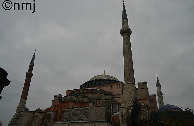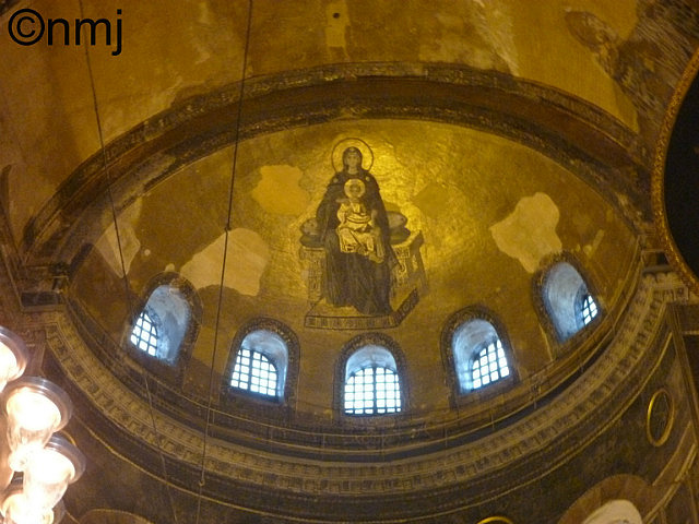 The bonus of taking so long in the Palace was that, by the time we were out, “Papa” had left and we could get into the Ayasofia. The Ayasofia is… a church? a mosque? a museum? Yes, to all three! It was built as the largest church in Byzantine by Emperor Constantine and enlarged by Emperor Justinian and then when Constantinople was overrun by the Ottoman Empire, it was turned into a Mosque, but many of the murals and mosaics were kept and can still be seen today. Sadly, the scaffolding monster heard that MJ was going to be in town so one half on the interior of the Ayasofia was covered in scaffolding!