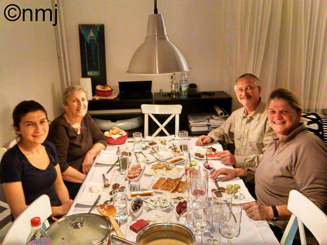 After a totally decadent afternoon and feeling like melted chocolate, we headed back to Oscar to get ready to go out to dinner with a Turkish family. Nick had posted a photo that he had taken of the Turkish Police BMW bikes on a BMW Facebook page and the next thing we knew, we had a dinner invitation to meet and have dinner in their home. So we got to trial the new Metro that runs under the Bosphorus, called the Marmaray and headed over to the Asian side of Istanbul to have dinner with Serkan, his wife and mother-in-law and had the most amazing dinner. Turkish food is similar to Greek & Lebanese cuisine in that the company and conversation is more important than the main course. So a meal starts with a variety of Meze dishes on the table and you help yourself and enjoy a glass of Raki with water (similar to Ouzo) and just sit, chat, eat & drink. Eventually, you will get around to eating the main meal which was the most delectable BBQ’d lamb cutlets. And another interest flavour was to sprinkle the cutlets with ground cumin – YUMMO!