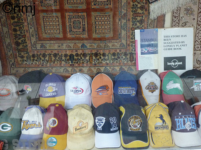 On our way back to the Campground, we stopped off at the Bazaar just below the Blue Mosque, called the Arasta Bazaar. On our first day walking to the Blue Mosque, we discovered this Bazaar and ended up buying a lovely small kilim to use in Oscar as a bit of extra warmth underfoot. But as we were walking through this Bazaar, we found a shop window which had all sorts of caps on display and the majority of them were for Australian football (league & AFL) teams! It turns out that Ferdie and Mustafa collect these caps from visitors who donate caps to the window. As Nick’s old Bundie (Bundaberg Rum) cap had been finally replaced, we offered to donate the old cap to the window. Ferdie was estatic, so we made a detour to hand over the cap, have a cup of Turkish Tea and enjoy a chat about carpets, caps and visitors to Turkey. If you are going to Istanbul and want to see some wonderful carpets, then go to the Arasta Bazaar and visit the Troy Rug Store – you’ll have no trouble recognising it because it will have a selection of Australian baseball-style caps in the shop window. They have an amazing selection of Carpets and Kilims, and love sharing their knowledge and the history of the different carpets/rugs/bags. It would have to be one of the shops with the least amount of pressure to buy.