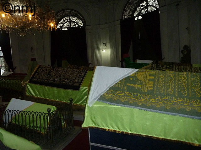 This “chapel” (?) contained a number of sarcophagi, containing the remains of the last 3 Sultans of the Ottoman Empire, and various members of their family. The tops of the sarcophagi are shaped life sloping roofs, with the head higher than the feet, and the most amazing fabric covers over them.