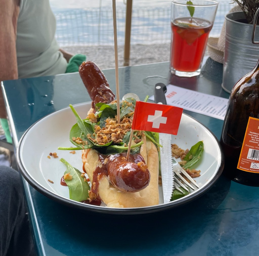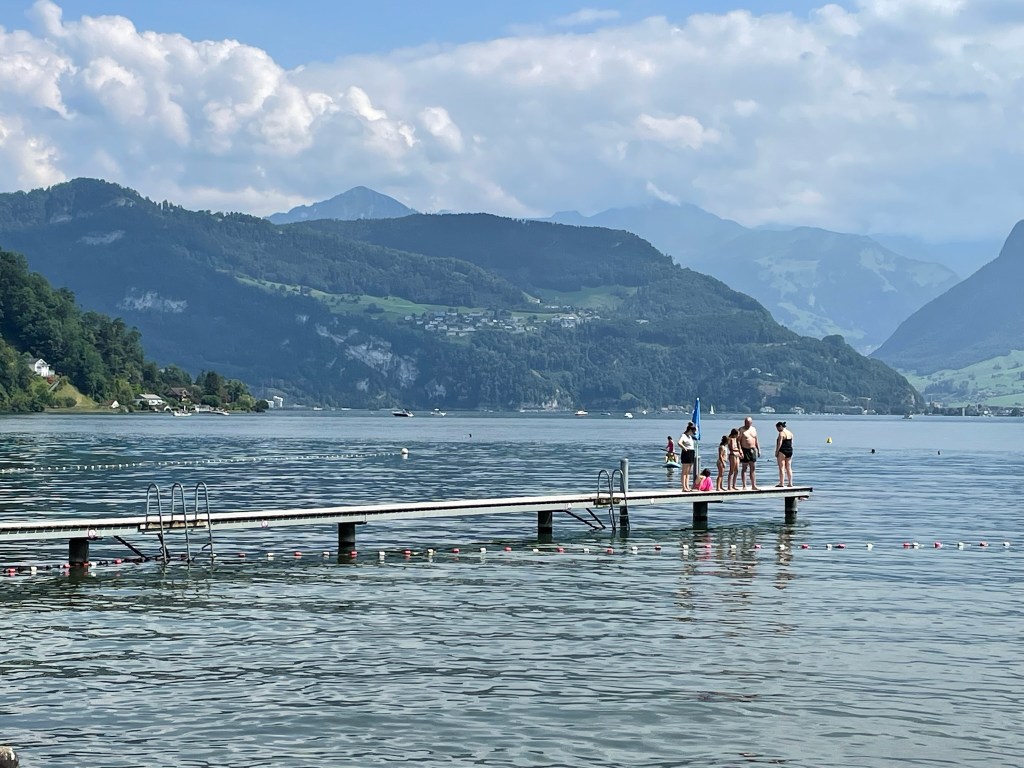 Now Switzerland is a country of many mountains, and in winter, these mountains have lots of snow and ice on them. And then in springtime, some of this snow and ice melts and runs down into the lakes, which means that even in the middle of a really hot summer, the lake is fecking freezing!!! But it did cool down our core temperatures which made it easier to sleep at night.
